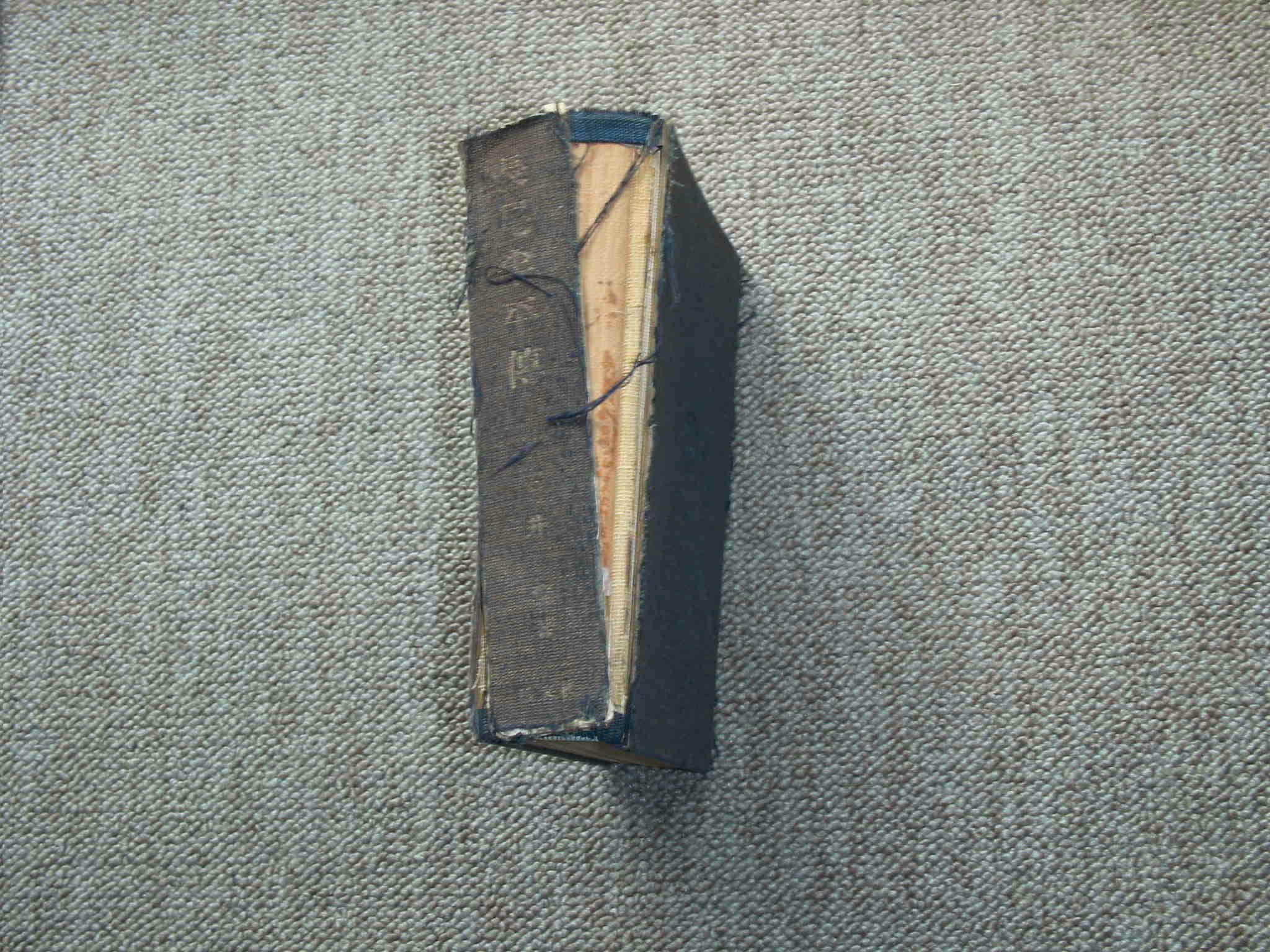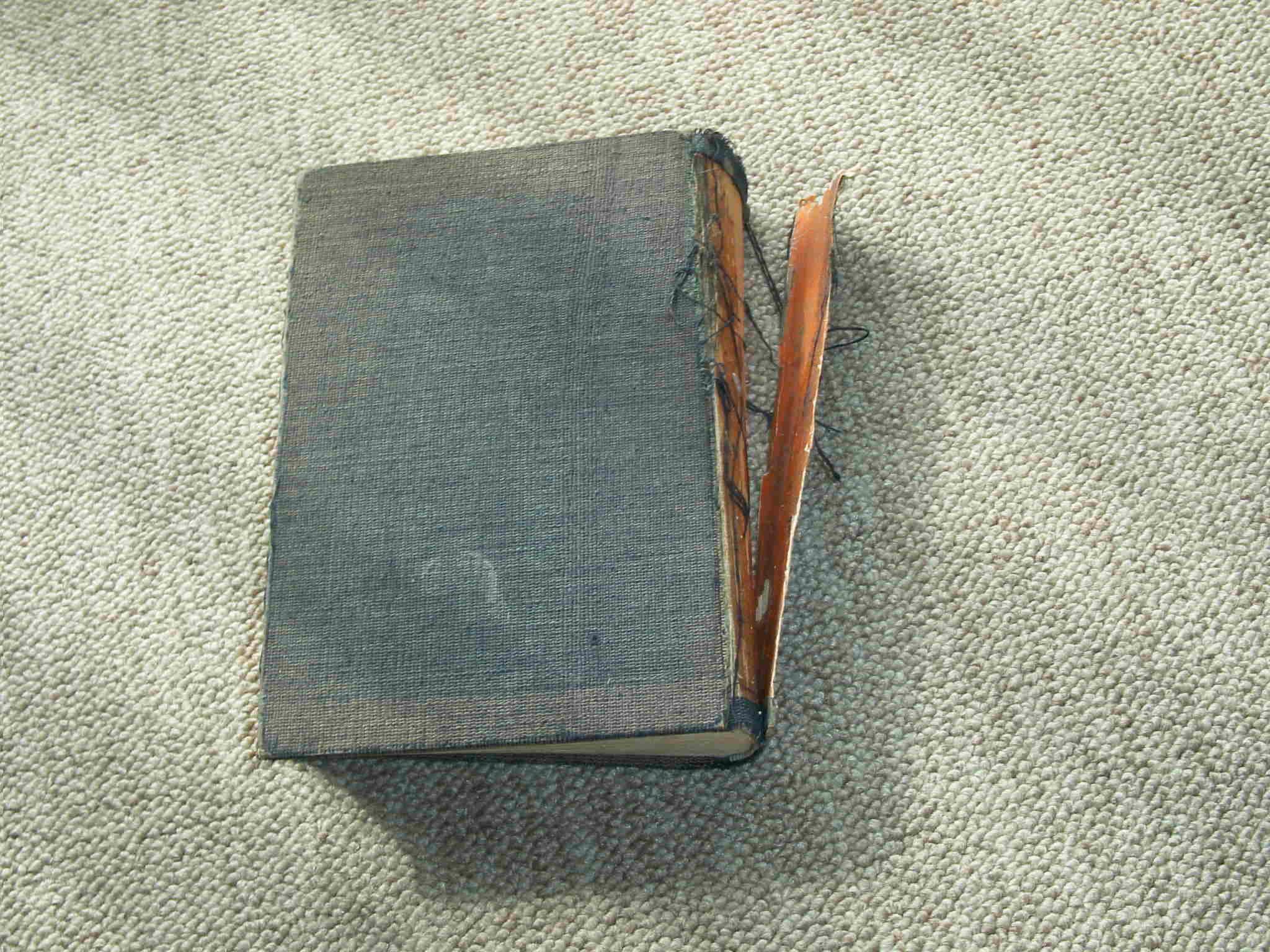 ハードカバーはぼろぼろになり、背表紙は完全に分離している。