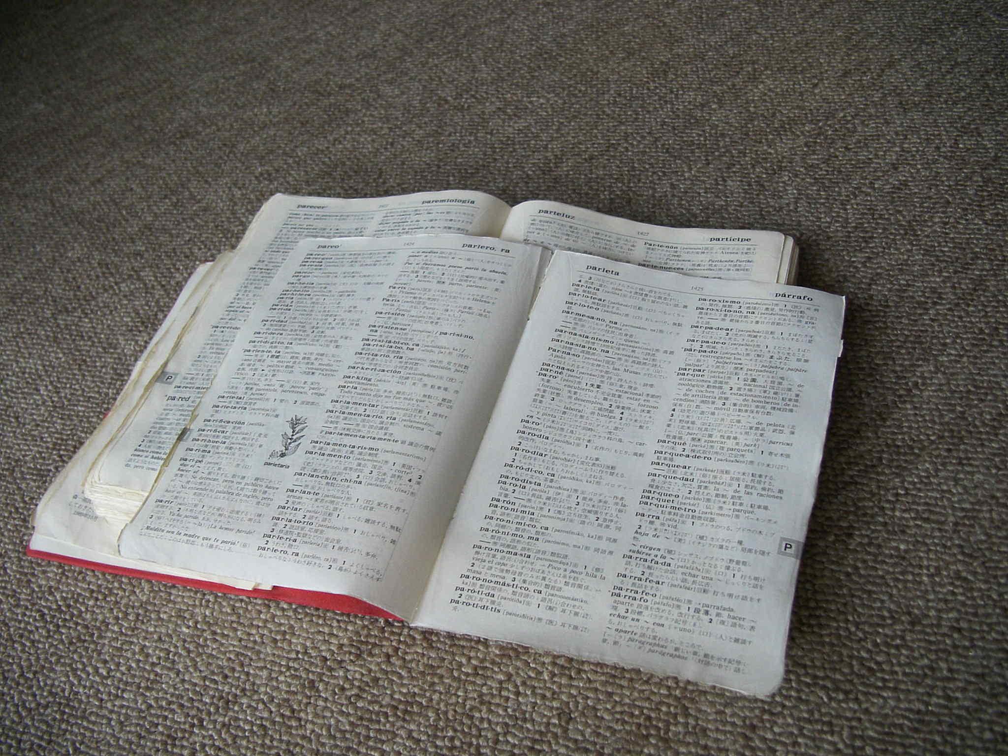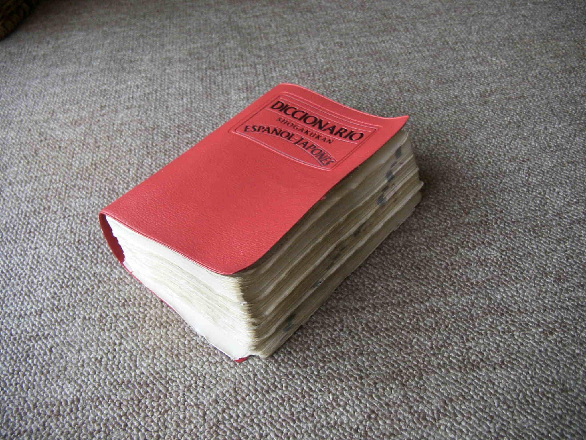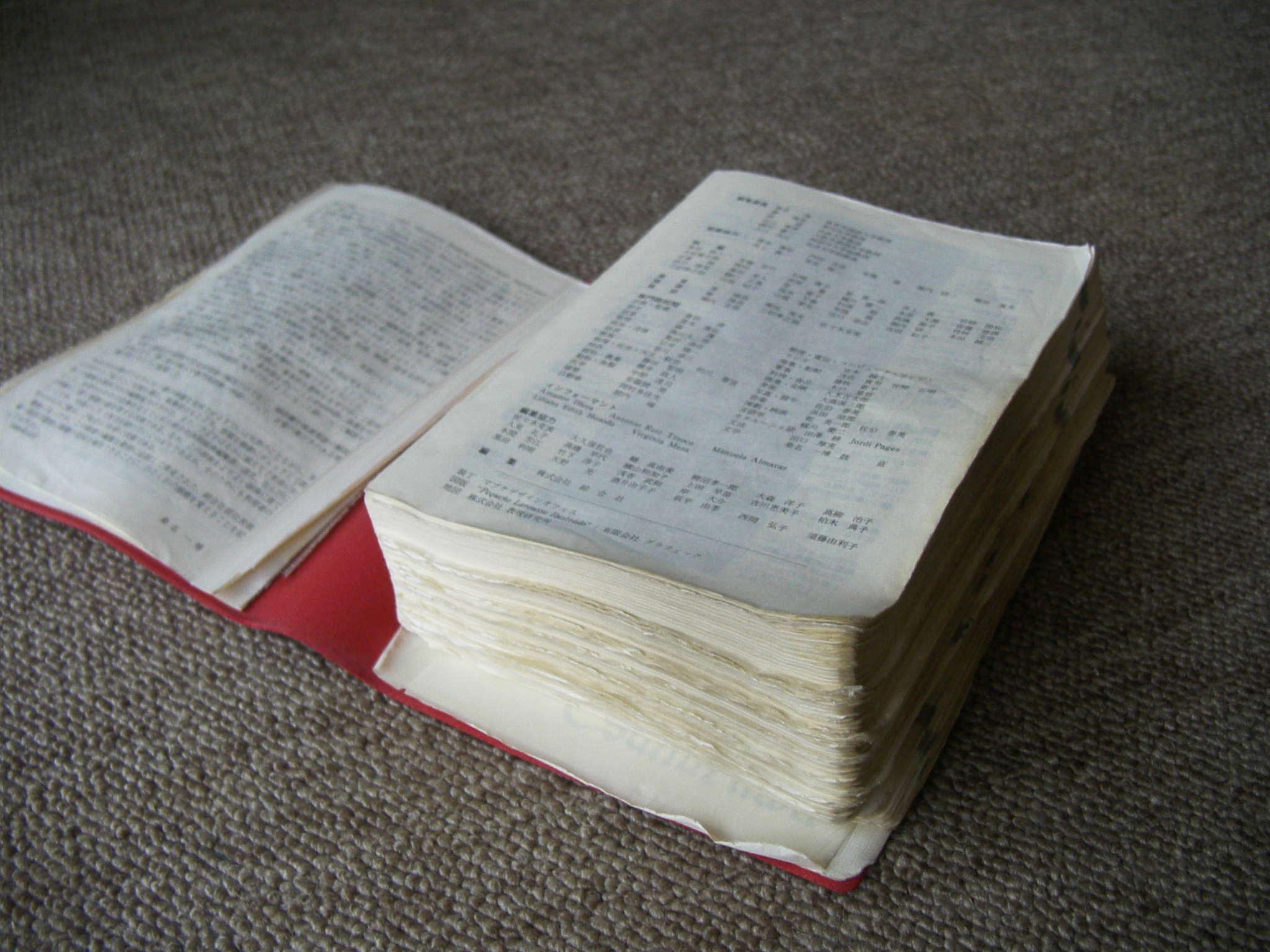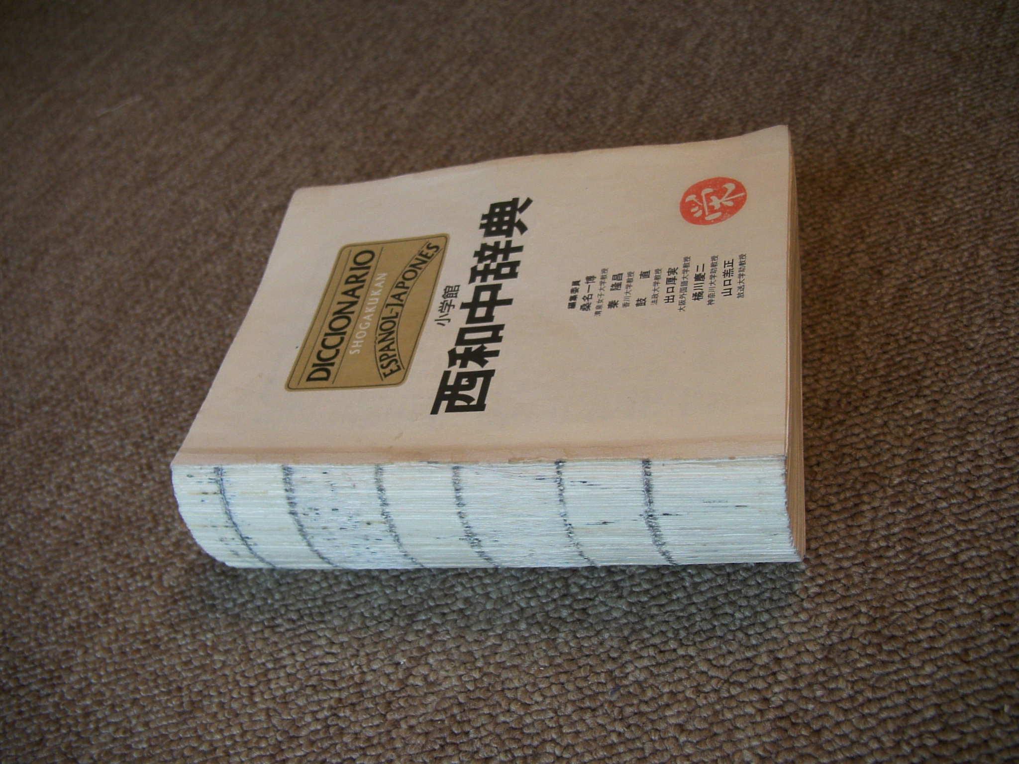 西和中辞典の修理 長年の使用により、一部の頁が綴じ糸より離れているものもある。全2000頁余り。